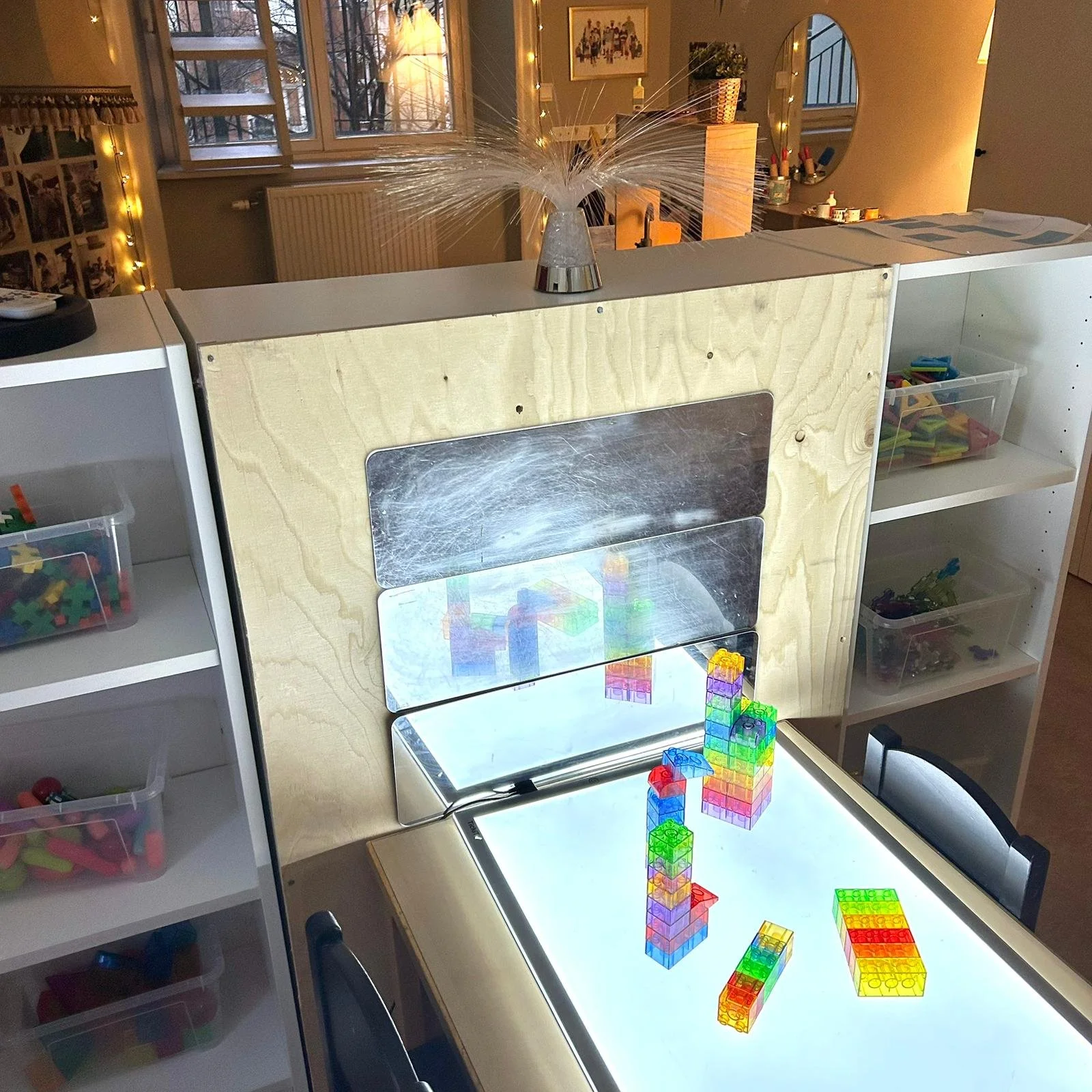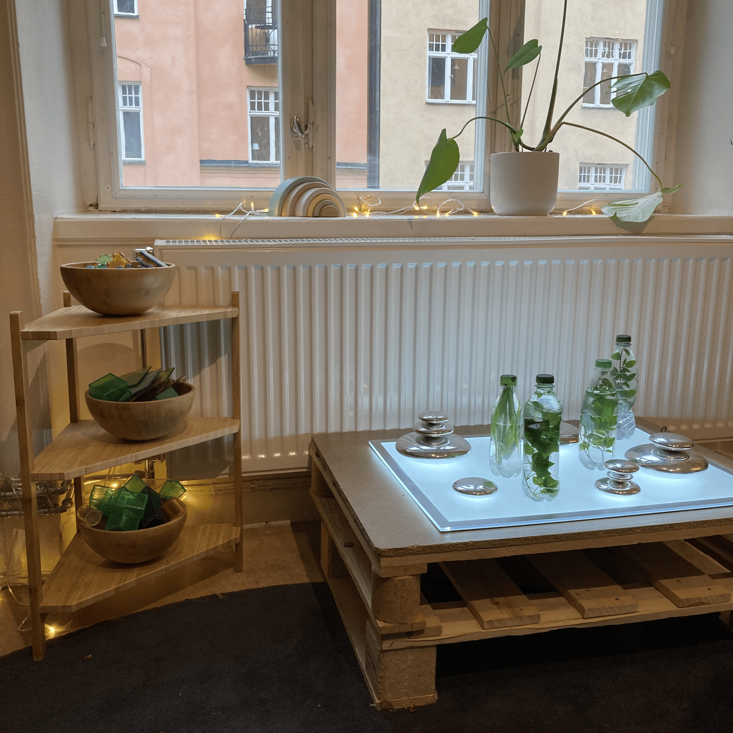 I denna del av vår pedagogiska miljö ges barnen möjlighet att utforska magnetism, ljus och kontraster samt olika digitala verktyg så som projektor, ljusbord, Bluebot och äggmikroskop.